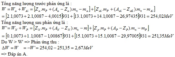 + n, khối lượng của các hạt nhân là mα = 4,0015 u, mAl = 26,97435 u, mP = 29,97005 u; mn = 1,008670 u; 1u = 931MeV/c2. Năng lượng mà phản ứng này tỏa ra hoặc thu vào là bao nhiêu?