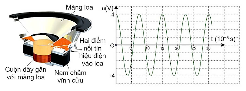 Hình bên mô tả cấu tạo của loa điện động và đồ thị điện áp – thời gian của một