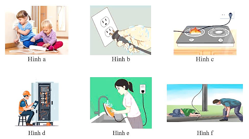 Hình bên dưới thể hiện một số tình huống nên và không nên làm để đảm bảo an toàn khi sử dụng điện. Những tình huống không nên làm để đảm bảo an toàn khi sử dụng điện được thể hiện ở