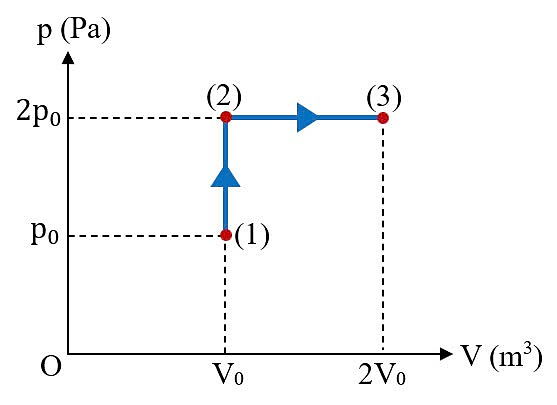 Trạng thái của n (mol) khí lí tưởng đơn nguyên tử thay đổi theo quá trình (1) → (2) → (3) được thể hiện trên đồ thị (p, V) như hình vẽ. Biết nhiệt độ tuyệt đối của khối khí ở trạng thái (1) là T (K). Trong cả quá trình (1) → (2) → (3), nhiệt lượng mà khối khí nhận được là