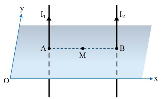 Cho hai dây dẫn thẳng dài vô hạn, đặt song song lần lượt có dòng điện I1 = 2 A và I2 = 4 A chạy qua. Xét mặt phẳng (Oxy) vuông góc với cả hai dây dẫn và cắt hai dây dẫn lần lượt tại A và B như hình vẽ bên. Biết AB = 8 cm, độ lớn cảm ứng từ tại một điểm cách dây dẫn thẳng dài một khoảng r (m) được xác định bằng biểu thức $B = 2.10^{- 7}\dfrac{I}{r}.$ Độ lớn cảm ứng từ do từ trường của hai dòng điện gây ra tại M (M là trung điểm AB) bằng