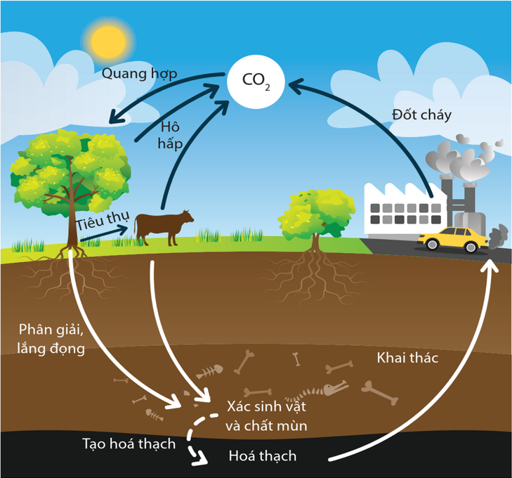 Sơ đồ bên biểu diễn chu trình carbon của một hệ sinh thái có 4 thành phần chính là khí quyển,