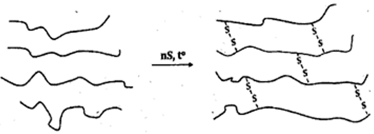 | a) Bản chất của quá trình lưu hoá cao su là phản ứng tăng mạch polymer, tạo ra cầu disulfide (-S-S-) giữa các phân tử polyisoprene tạo thành polymer có cấu tạo mạng lưới không gian. | ||