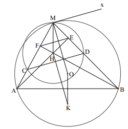 Cho đường tròn tâm $O$, dây $AB$. Điểm $M$ di chuyển trên cung lớn $AB$. Các đường cao $AE,\,\, BF$