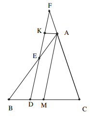 Cho tam giác $ABC$, trung tuyến $AM$. Qua điểm $D$ thuộc cạnh $BC$, vẽ đường thẳng song song với $AM$, cắt $AB,\,\, AC$ tương ứng tại $E,\,\, F$. Qua $A$ vẽ đường thẳng song song với $BC$, cắt $FE$ tại $K$. Chứng minh rằng $K$ là trung điểm của $FE$