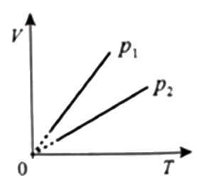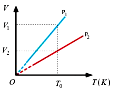 Trên đồ thị V – T vẽ hai đường đẳng áp của cùng một khối lượng khí xác định. Nhận định nào sau đây là đúng?