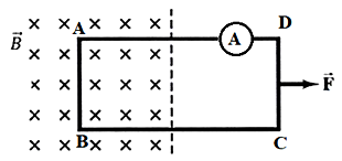 Một khung dây dẫn hình chữ nhật ABCD với cạnh AB dài 45 cm, có điện trở $0,3\,\,\Omega$ được đặt sao cho một phần của khung nằm trong từ trường đều (hình vẽ). Biết vectơ cảm ứng từ nằm ngang, hướng vào trong, vuông góc với mặt phẳng khung dây và có độ lớn 0,5 T. Ampe kế có điện trở không đáng kể, bỏ qua tác dụng của trọng lực. Tác dụng lực kéo $\overset{\rightarrow}{F}$, khung dây chuyển động thẳng đều sang bên phải với vận tốc 0,25 m/s. Xét trong thời gian các đường sức từ còn đi qua mặt phẳng giới hạn bởi khung dây.