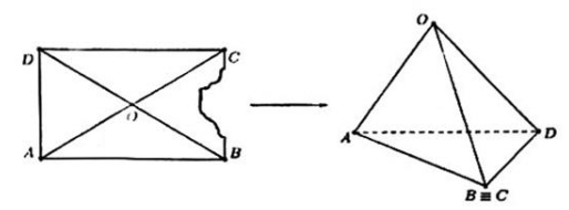 Trên công trường xây dựng, một công nhân muốn tạo ra một dụng cụ để đựng vật liệu lỏng từ một tấm thép hình chữ nhật $ABCD$ tâm $O$ có $AB = 3,2m,\,\, AD = 2,4m$. Do tấm thép bị hỏng một phần (tham khảo hình vẽ) nên người đó cắt bỏ tam giác $OBC$ và hàn hai mép $OB,\,\, OC$ với nhau để thu được một hình tứ diện $OABD$ (không có mặt $ABD$). Dụng cụ này sẽ được vùi đất xung quanh sao cho đỉnh $O$ quay xuống và mặt $ABD$ hướng lên trên, khi đựng đầy vật liệu lỏng thì phần không gian trong lòng của dụng cụ hoàn toàn bị lấp đầy. Tính thể tích của vật liệu lỏng được đựng đầy trong dụng cụ. (Kết quả làm tròn đến hàng phần chục của đơn vị $m^{3}$ và xem độ dày của tấm thép không đáng kể).
