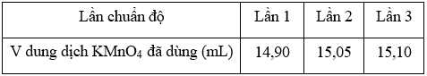 Hòa tan 0,350 gam mẫu khoáng vật của sắt trong dung dịch sulfuric acid dư, sao cho tất cả lượng sắt có trong quặng đều chuyển thành Fe2+, thu được dung dịch X. Chuẩn độ Fe2+ trong dung dịch X ba lần bằng chất chuẩn là dung dịch thuốc tím KMnO4 0,015M. Kết quả: