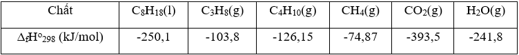 Cho bảng giá trị enthalpy tạo thành chuẩn của một số chất sau: butane khí (1); octane lỏng (2); propane khí (3); methane khí (4).