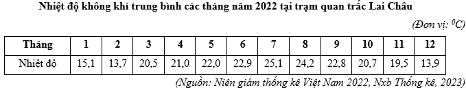 Căn cứ vào bảng số liệu trên, hãy cho biết nhiệt độ không khí trung bình năm 2022 tại trạm quan trắc Lai Châu là bao nhiêu 0C (làm tròn kết quả đến một chữ số thập phân).
