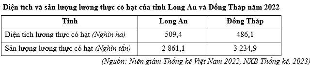Căn cứ vào bảng số liệu trên, hãy cho biết năng suất lương thực có hạt của tỉnh Long An thấp hơn tỉnh Đồng Tháp bao nhiêu tạ/ha? (làm tròn kết quả đến một chữ số thập phân).