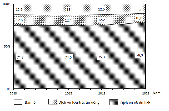 Dựa vào tỉ trọng ngành bán lẻ; ngành dịch vụ lưu trú, ăn uống; ngành dịch vụ và du lịch năm 2022 và so sánh với năm 2010.