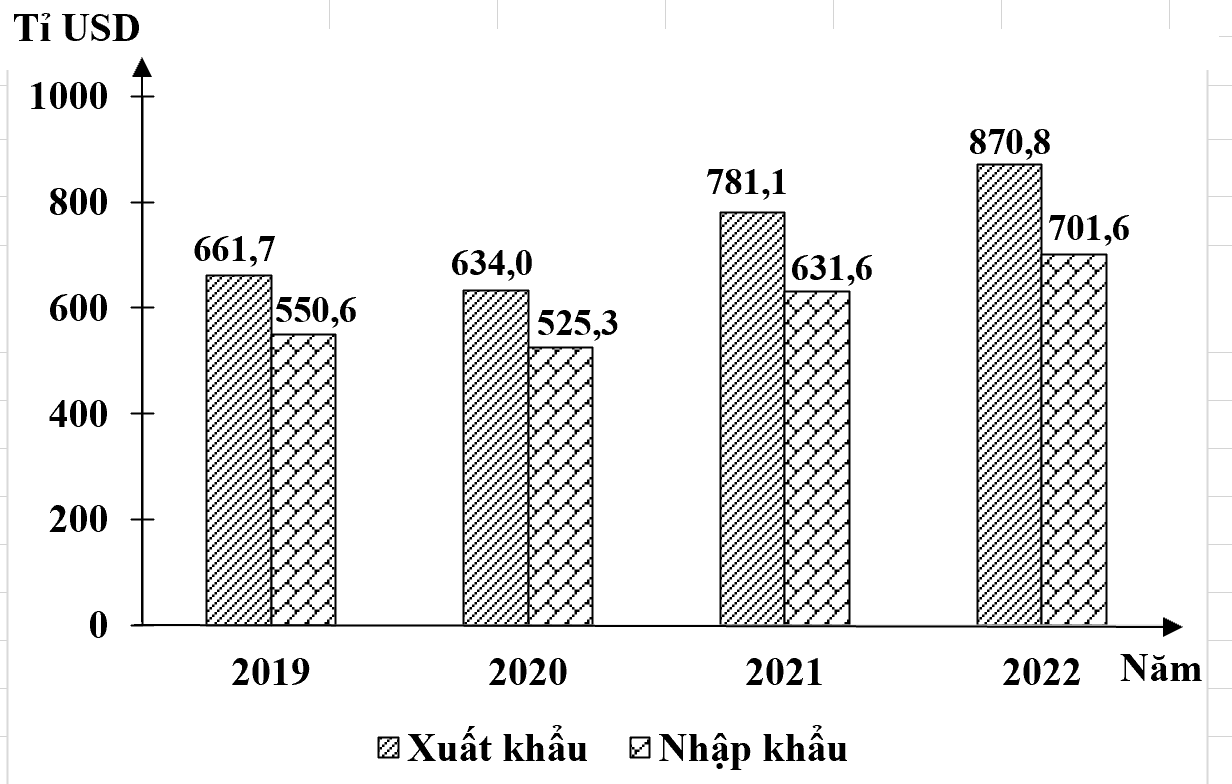 Cho biểu đồ sau: Biểu đồ trị giá xuất khẩu, nhập khẩu hàng hóa và
