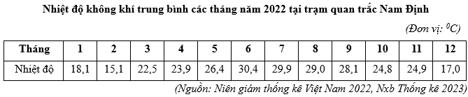 Căn cứ vào bảng số liệu trên, hãy cho biết nhiệt độ không khí trung bình năm 2022 tại trạm quan trắc Nam Định là bao nhiêu 0C (làm tròn kết quả đến một chữ số thập phân).