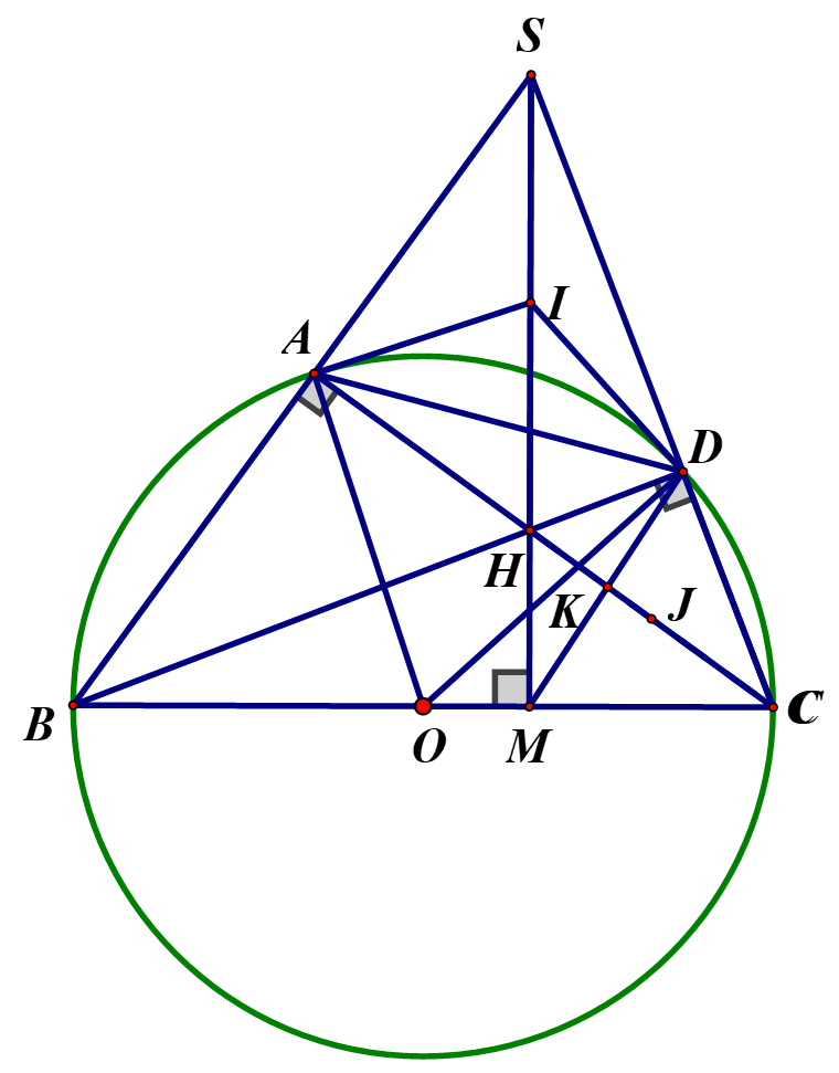 Cho đường tròn $(O)$, đường kính$BC$. Trên nửa đường tròn $(O)$, lấy hai điểm A và D (theo thứ tự B, A, D, C). Tia BA và CD cắt nhau tại S, đoạn thẳng AC cắt BD tại H. Gọi I là trung điểm của SH.