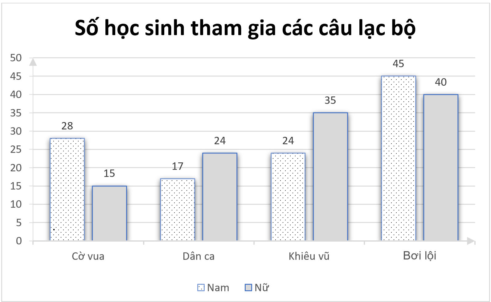 Biểu đồ cột kép bên dưới biểu diễn số học sinh khối 9 của trường THCS A trên địa bàn Thành phố Hồ Chí Minh tham gia các câu lạc bộ do nhà trường tổ chức. Biết rằng mỗi bạn chỉ tham gia đúng một câu lạc bộ.