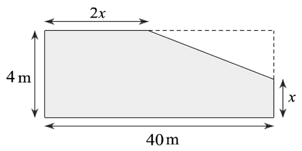 Ông Hiệp có một mảnh đất hình chữ nhật có chiều rộng là 4 m và chiều dài là 40 m. Nhà nước làm một con đường đi ngang qua mảnh đất của ông Hiệp và thu hồi một phần đất của ông Hiệp (phần hình tam giác). Phần đất không bị thu hồi có kích thước như hình vẽ dưới (phần tô đậm).