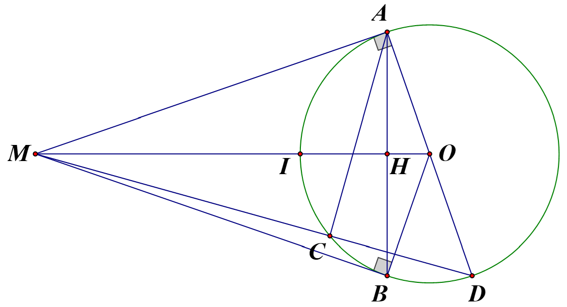 Cho đường tròn $\left( {O;R} \right)$ và điểm $M$ nằm ngoài đường tròn. Qua $M$ kẻ hai tiếp tuyến $MA,$$MB$ với đường tròn $\left( {O;R} \right)$ ($A$, $B$ là các tiếp điểm). Đoạn thẳng $OM$ cắt đường thẳng $AB$ tại $H$ và cắt đường tròn $\left( {O;R} \right)$ tại điểm $I$.