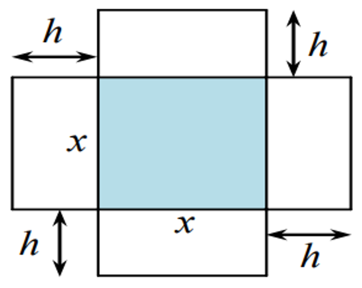 Một hình hộp không có nắp được làm từ một mảnh bìa giấy theo như hình vẽ. Hộp có đáy là một hình vuông cạnh $x$ cm, chiều cao $h = 10$cm.