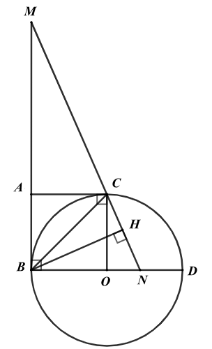 Cho đường tròn (O) đường kính BD = 2R, trên tiếp tuyến tại B của đường tròn (O) lấy điểm A sao cho BA = R. Từ A vẽ tiếp tuyến AC của (O) (C là tiếp điểm và C khác B). Một đường thẳng qua C lần lượt cắt tia BA và tia BO tại M và N. Vẽ BH vuông góc MN tại H.