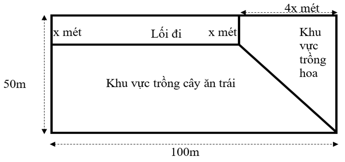 Một khu vườn hình chữ nhật có chiều dài 100m, chiều rộng 50m. Người ta làm một lối đi có dạng hình chữ nhật, khu vực trồng hoa có dạng hình thang vuông, còn lại là khu vực trồng cây ăn trái với kích thước như hình vẽ bên dưới.