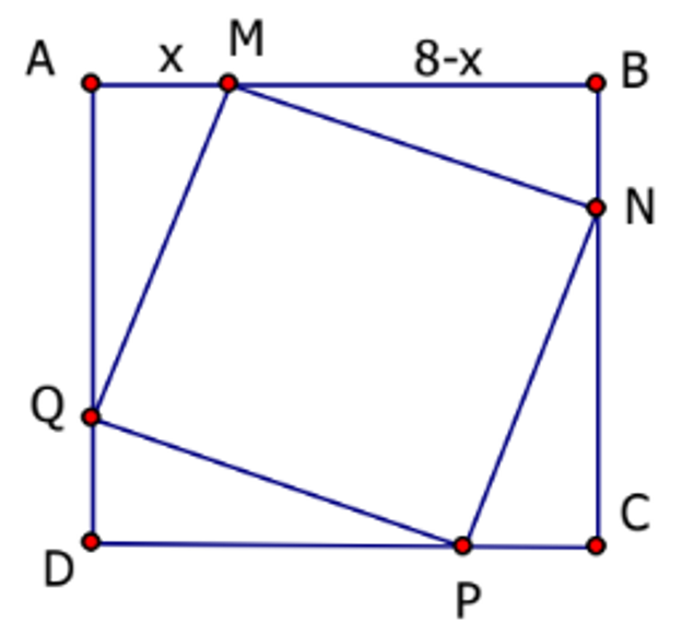 Một cái sân hình vuông ABCD có cạnh là 8 m. Người ta muốn lát gạch màu khác để trang trí lên mảnh sân hình vuông MNPQ nội tiếp trong sân hình vuông ABCD. Tìm vị trí của M, N, P, Q để hình vuông MNPQ có diện tích nhỏ nhất.