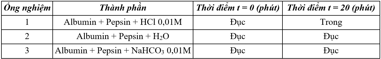 | c) Ở ống nghiệm 3, nếu thay Pepsin thành Chymotrypsin thì hiện tượng quan sát được là “từ đục thành trong” sau thí nghiệm. | ||