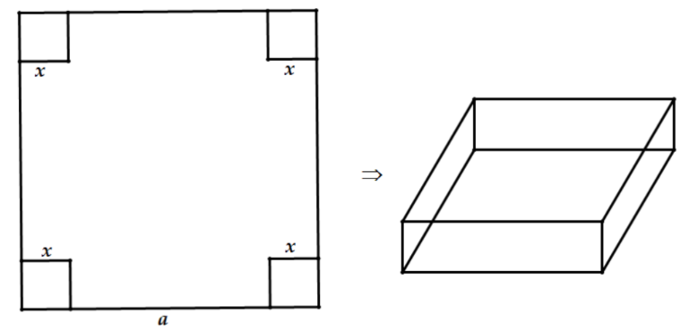 Một miếng tôn phẳng hình vuông với kích thước a (cm), người ta muốn cắt đi ở bốn góc bốn hình vuông cạnh bằng x (cm) để uốn thành một hình hộp chữ nhật không có nắp. Phải cắt như thế nào để hình hộp có thể tích lớn nhất?