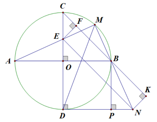 Cho (O) đường kính AB. Kẻ đường kính CD vuông góc với AB. Lấy M thuộc cung nhỏ BC, AM cắt CD tại E. Qua D kẻ tiếp tuyến với (O) cắt đường thẳng BM tại N. Gọi P là hình chiếu vuông góc của B lên DN.
