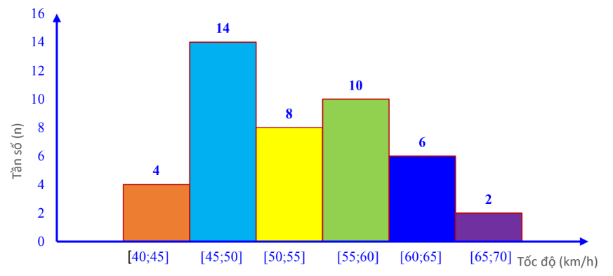 Biểu đồ tần số ghép nhóm dưới đây ghi lại tốc độ (đơn vị: km/h) của 44 ô tô khi đi qua