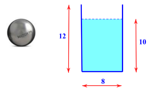 b) Người ta thả từ từ một viên bi làm bằng thép đặc (không thấm nước) có thể tích là $4\pi$ $\left( {cm^{3}} \right)$ vào trong cốc. Hỏi mực nước trong cốc lúc này là bao nhiêu cm?