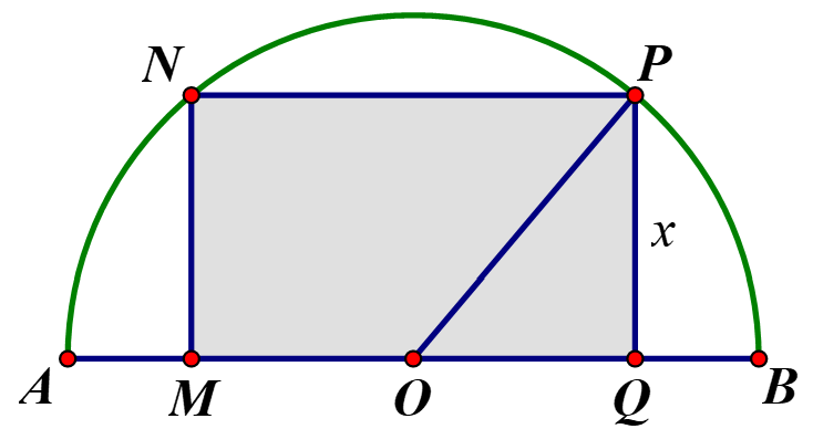 Tìm diện tích lớn nhất của hình chữ nhật $MNPQ$ nội tiếp trong nửa đường tròn $(O)$ bán