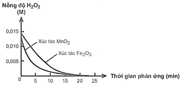 Hai chất MnO2 và Fe2O3 đều có khả năng xúc tác cho phản ứng phân hủy H2O2. Đo nồng độ H2O2 theo thời gian, thu được đồ thị sau: