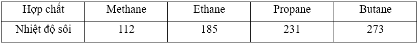 Nhiệt độ sôi của methane, ethane, propane và butane được cho trong bảng sau: