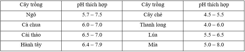 Một số loại thực vật chỉ phát triển tốt ở môi quan trọng trong nông nghiệp. Một số loại cây trồng trường có pH phù hợp, việc nghiên cứu pH của đất rất phù hợp với đất có giá trị pH cho trong bảng sau: