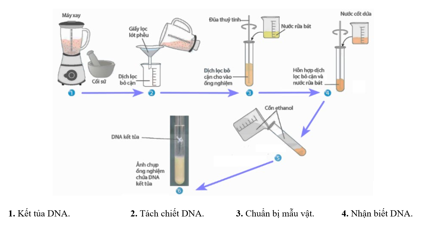 Hãy viết liền các số tương ứng với bốn bước theo đúng trình tự của quy trình tách chiết DNA.
