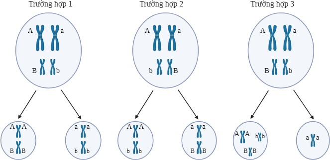 Hình dưới đây thể hiện một nhóm gồm 3 tế bào sinh tinh đều có kiểu gene AaBb đang ở kì giữa và kì cuối giảm phân I theo 3 trường hợp; trong đó có một tế bào diễn ra theo trường hợp 1; một tế bào diễn ra theo trường hợp 2; một tế bào diễn ra theo trường hợp 3; các giai đoạn còn lại của giảm phân diễn ra bình thường. Theo lí thuyết, tỉ lệ giao tử bình thường tạo ra là bao nhiêu? (tính làm tròn đến 2 chữ số sau dấu phẩy)