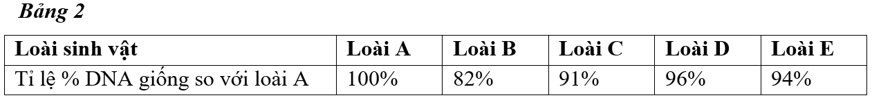Để xác định mối quan hệ họ hàng giữa loài A và các loài B, C, D, E người ta nghiên cứu mức độ giống nhau về DNA của các loài này. Kết quả thu được như bảng 2