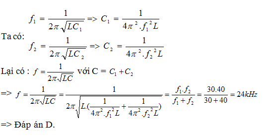 Trong mạch dao động điện từ LC, khi dùng tụ điện có điện dung C1 thì tần số dao động là f1 = 30kHz, khi dùng tụ điện có điện dung C2 thì tần số dao động là f2 = 40kHz. Khi dùng hai tụ điện có các điện dung C1 và C2 ghép song song thì tần số dao động điện từ là