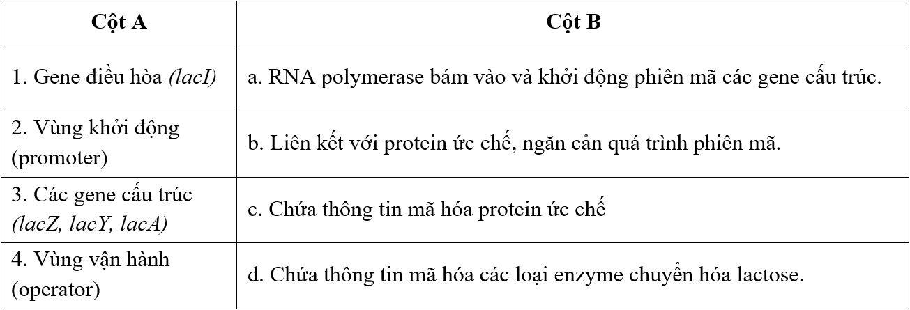 Ghép cột A với cột B sao cho phù hợp với mô tả về cơ chế điều hoà biểu hiện gene của operon lac ở vi khuẩn E. coli.
