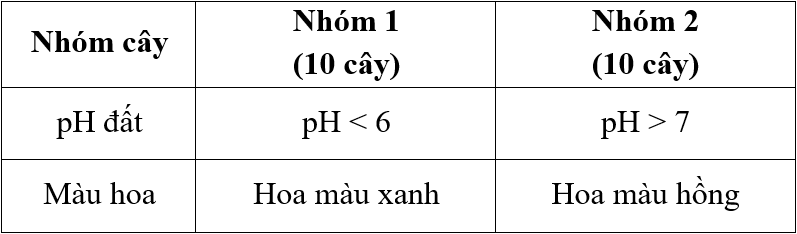 Một học sinh làm thí nghiệm trồng 20 cây hoa cẩm tú cầu (Hydrangea macrocarpa) có cùng kiểu gene ở 2 loại đất có pH khác nhau, kết quả thu được như bảng sau: