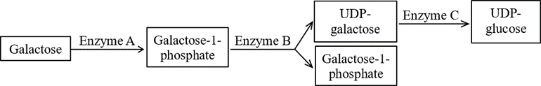 Ở người, bệnh galactosemia là bệnh rối loạn chuyển hóa do đột biến gene lặn trên nhiễm sắc thể thường gây thiếu hụt enzyme trong con đường chuyển hóa galactose thành UDP - glucose. Khi trong kiểu gene có đủ các allele trội A, B, C mã hóa các enzyme tương ứng A, B, C quy định kiểu hình bình thường, các kiểu gene còn lại quy định bệnh galactosemia. Con đường chuyển hóa galactose được mô tả ở hình sau: