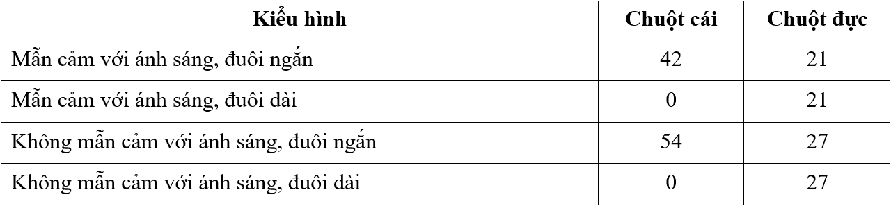 Có những con chuột, khi trong tế bào tổng hợp đầy đủ sắc tố melanine khiến chúng không mẫn cảm với ánh sáng mặt trời. Ngược lại, khi trong tế bào không tổng hợp đầy đủ sắc tố melanine khiến chúng rất mẫn cảm với ánh sáng mặt trời. Dưới tác động của ánh sáng mặt trời, chúng có thể bị đột biến dẫn đến ung thư da. Người ta chọn lọc được hai dòng chuột thuần chủng, dòng thứ nhất (dòng 1) mẫn cảm với ánh sáng mặt trời và đuôi dài, dòng thứ hai (dòng 2) mẫn cảm với ánh sáng mặt trời và đuôi ngắn. Ở thế hệ P, khi đem lai chuột cái dòng 2 với chuột đực dòng 1 thu được các chuột F1 toàn đuôi ngắn và không mẫn cảm với ánh sáng. Cho các cá thể F1 giao phối với nhau, thu được F2 có các loại kiểu hình thể hiện ở bảng sau: