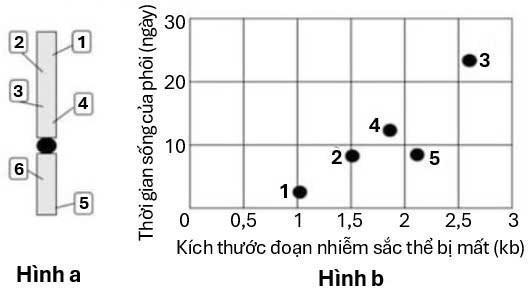 Trong một thí nghiệm, các nhà khoa học đã xử lý phôi của một loài côn trùng gây đột biến mất đoạn NST ở 6 vị trí khác nhau (từ 1 đến 6 như Hình a). Theo dõi thời gian sống của các phôi mang đột biến mất đoạn tương ứng các vị trí thể hiện qua đồ thị Hình b. Kích thước đoạn bị mất tính theo đơn vị nghìn cặp nucleotide (kb). Biết sự phân bố các gene trên NST là tương đối đều nhau, phôi mang đột biến mất đoạn ở vị trí 6 vẫn sống và phát triển thành cơ thể bình thường.