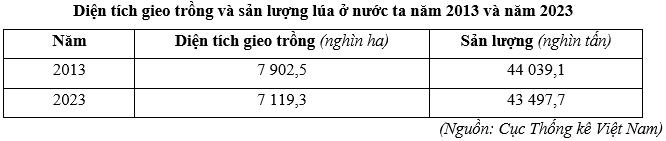 Căn cứ vào bảng số liệu trên, hãy cho biết năng suất lúa của nước ta năm 2023 so với năm 2013 tăng thêm bao nhiêu tạ/ha (làm tròn kết quả đến hai chữ số thập phân).