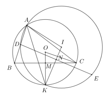 Cho tam giác $ABC$ nhọn không cân, $AB < AC$ nội tiếp $(O)$. Gọi $K$ là điểm chính giữa cung nhỏ
