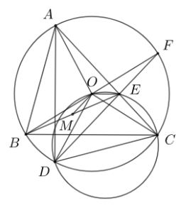 Chứng minh $OE \parallel BC$ (do hai góc $\angle ACB,\,\,\angle AEO$ đồng vị)