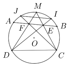 Cho đường tròn $(O)$ và hai dây cung $AB,\,\, CD$ bất kì. Gọi $M$ là điểm chính giữa cung nhỏ $AB$. Gọi $E,\,\, F$ tương ứng là giao điểm của $MC,\,\, MD$ với dây $AB$. Gọi $I,\,\, J$ tương ứng là giao điểm của $DE,\,\, CF$ với đường tròn $(O)$. Chứng minh $IJ$ vuông góc với $OM$