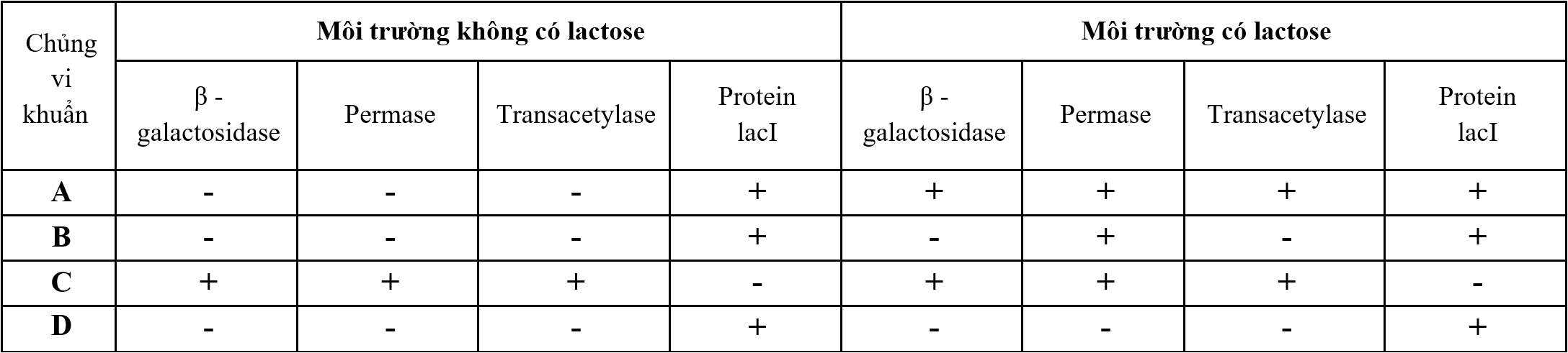 Ở vi khuẩn E. coli kiểu dại, sự biểu hiện của gene lacZ (mã hóa β-galactosidase), gene lacY (mã hóa permease), gene lacA (mã hóa transacetylase) thuộc operon lac phụ thuộc vào sự có mặt của lactose trong môitrường nuôi cấy; protein ức chế (LacI) do gene ức chế lacI quy định. Bằng kỹ thuật gây đột biến nhân tạo, ngườita đã tạo ra được các chủng vi khuẩn khác nhau và được nuôi cấy trong hai môi trường: không có lactose và có lactose. Sự biểu hiện gene của các chủng vi khuẩn được thể hiện ở Bảng 1: